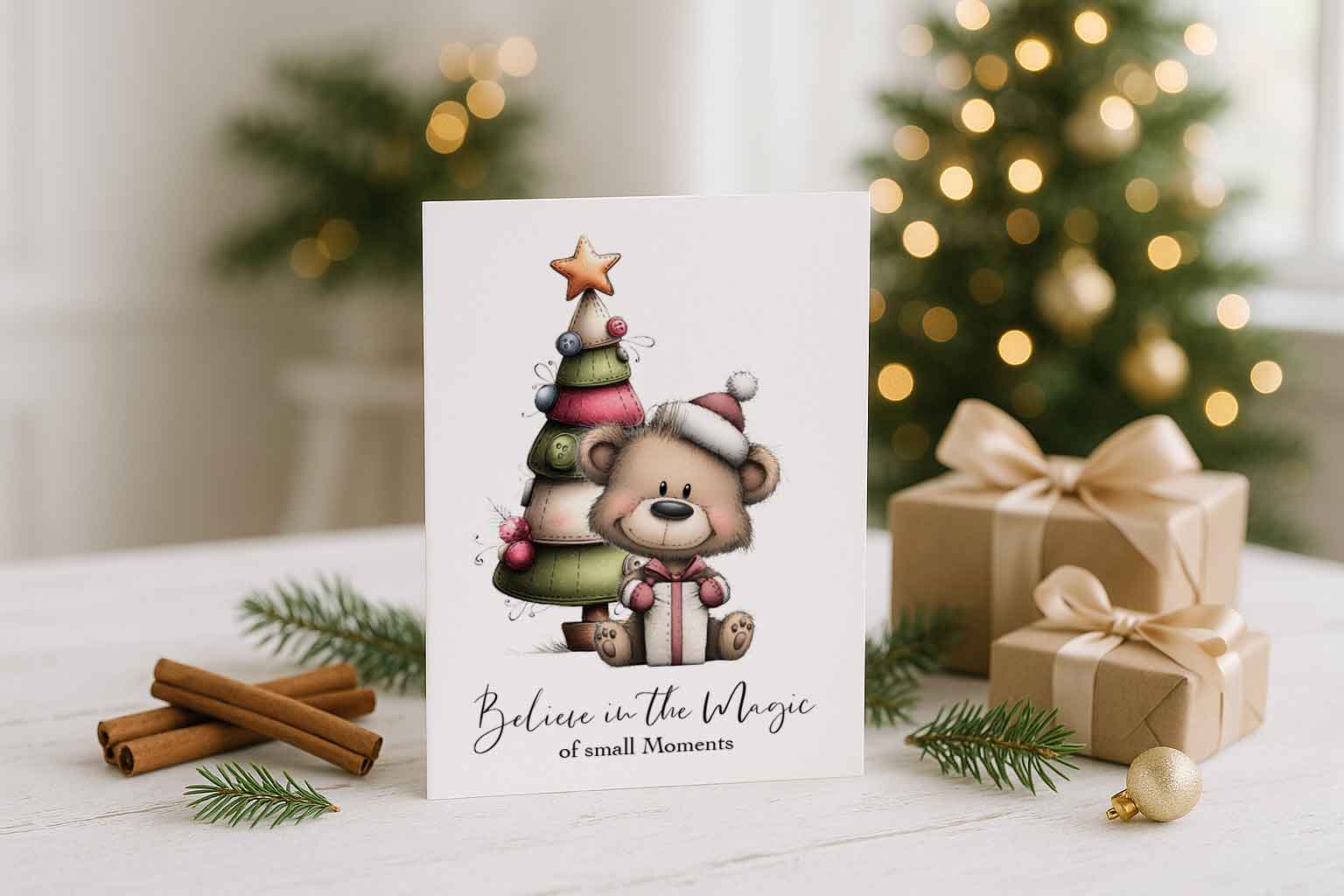The “Believe in the Magic of Small Moments” card encourages us to cherish the little things that make the season special. Its design mirrors the bear and tree theme – you’ll see the same adorable bear (now holding a tiny gift) sitting happily beside a Christmas tree adorned with ornaments. The scripted text “Believe in the Magic of small Moments” on the card front is a gentle reminder to find wonder in everyday holiday scenes: a child’s giggle while ornament-hanging, the cozy glow of lights on a quiet night, or a shared cookie with a friend. The artwork’s soft colors and cute style create a nostalgic, whimsical mood. This card is perfect for sending a bit of inspiration and comfort, helping friends and family slow down and remember that holiday magic is often found in the small moments.
