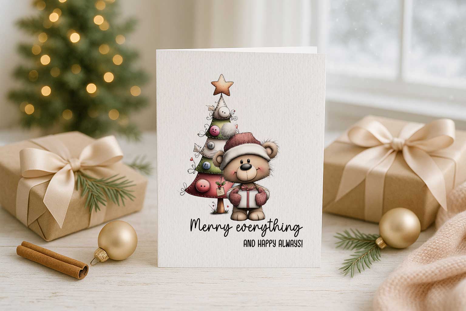 The “Merry Everything” card features a cuddly bear in a Santa hat next to a whimsical Christmas tree. The bear is holding a present and smiling, while the tree is decorated with buttons, ribbons, and a star on top, giving it a crafty, handmade feel. The phrase “Merry everything and happy always!” on the card reminds us to celebrate all the little moments of the season with joy. This card’s warm, inclusive message and playful artwork make it perfect for spreading cheer to everyone on your list, no matter what they celebrate. Its cozy design (notice the rustic gifts and pine sprigs in the scene) sets a heartwarming, homespun tone that any recipient will adore.