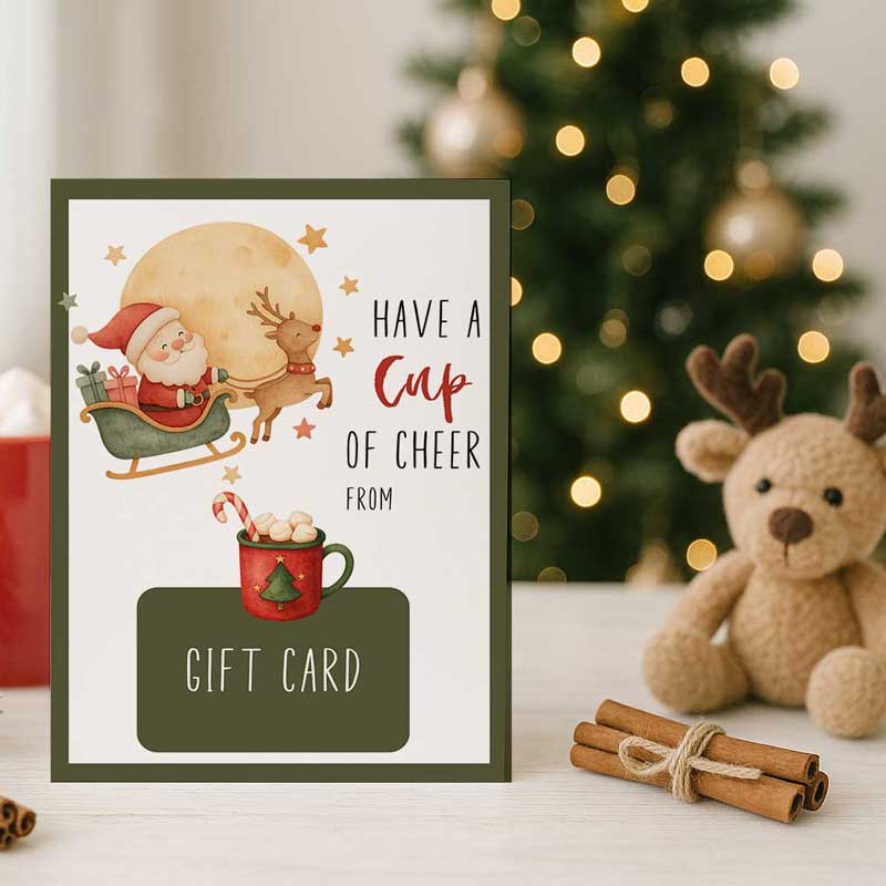 Bring warmth and joy to your holiday gifting with this charming printable Christmas gift card holder! Featuring a jolly Santa in a sleigh, flying across a golden moonlit sky, and a festive cup of hot cocoa, this design reads “Have a Cup of Cheer” — the perfect sentiment for cozy winter gifts.