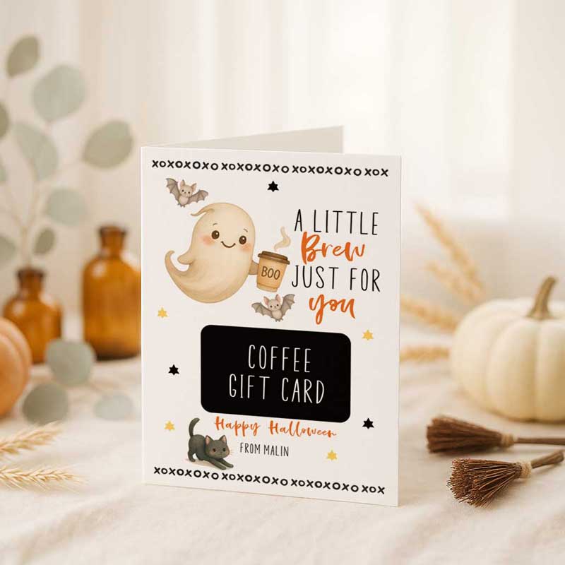 Surprise your coffee-loving friends, teachers, coworkers, or neighbors with this spooky-cute Halloween coffee gift card holder! Featuring a cheerful ghost holding a “BOO” cup, fluttering bats, stars, and a black cat, this printable card is the perfect way to say “A little brew just for you!” ??