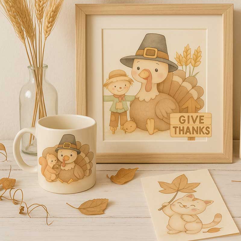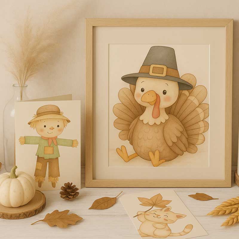 Themes: turkeys, pilgrims, pumpkins, wheat, scarecrow, autumn harvest, animals, and more