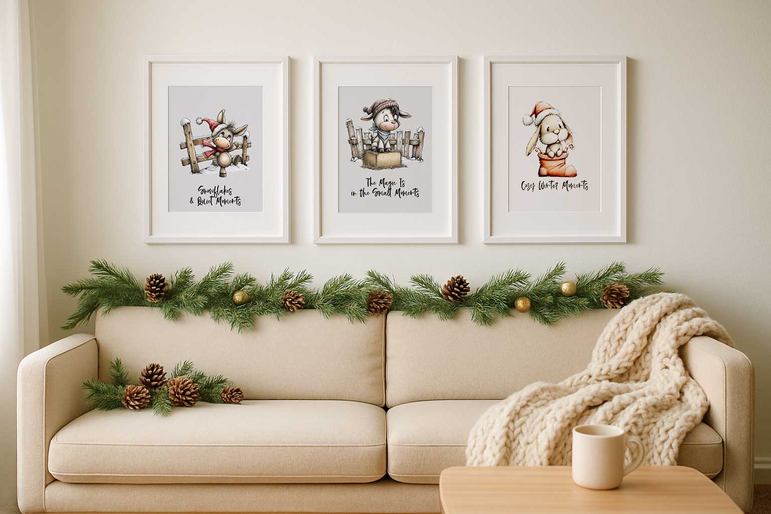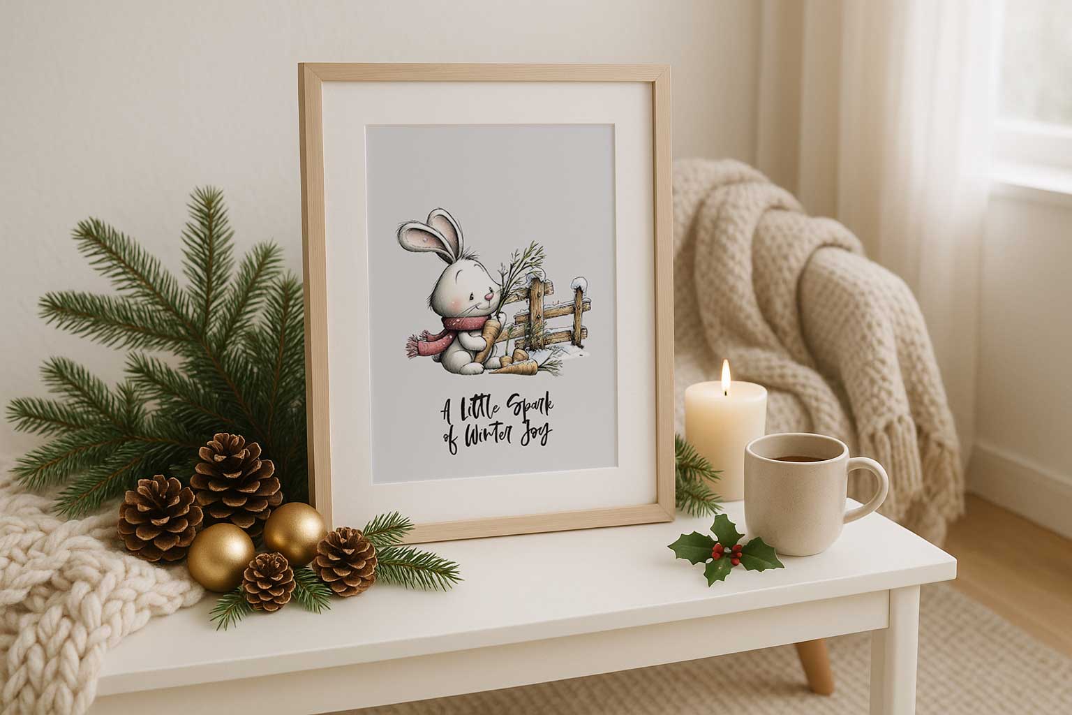 Try placing the print next to a basket of cozy throws, your favorite winter mug, or a hot cocoa station. These tiny details create warmth instantly — especially during the busy holiday weeks.